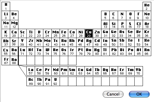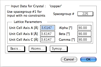 通常の CrystalKitX ファイル (拡張子 [.at] ) は、MacTempasX と互換性があります。さらに、もし単位格子定義ツールによって作った結晶構造の場合は、ファイルのリソースフォークに2種類の単位格子のデータを保持しています。 データを手入力する場合は、以下のようなダイアログボックスが表示されます。