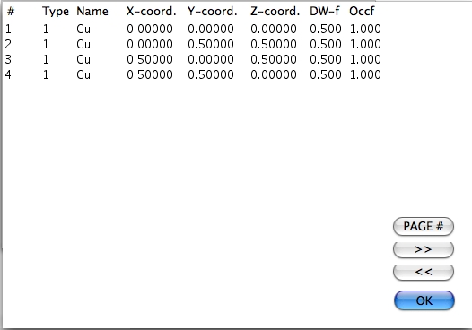 1つの単位格子の構造を表示させると、ウィンドウ隅の原子リストにも原子が表示されます。たとえば基本原子リストに原子 が1つだけある (x=0,y=0,z=0) とき、これを編集して (1,0,0), (1,1,0), (1,1,1), (0,1,0) などの原子を作ったとき、スクリーンにはそれらの原子も表示されます。これらの構造は、Save Crystal A/B コマンドを使って保存することができます。