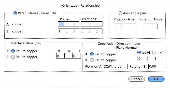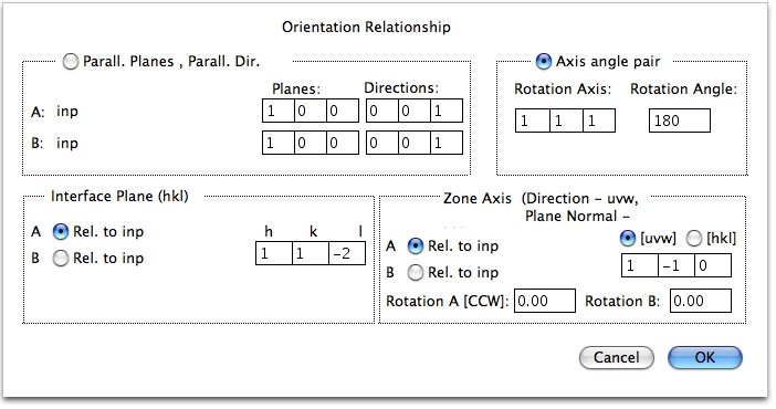 2つの結晶の方位関係を定義します。設定の仕方には 2通りあります。一般的に使用されるのは、2つの結晶の平行な面の方向で定義します。もちろん、それぞれ結晶の軸方向と回転角度を指定して定義することもできます。軸/角度のセットで定義するのは、それぞれの結晶が独立に設定されている場合に使用します。この場合は、特定の軸で回転する前に、2つの結晶は互いに平行な状態に置かれているものとします。