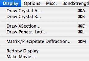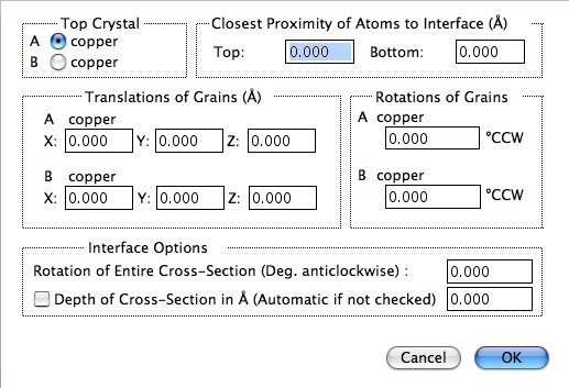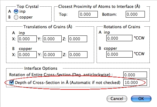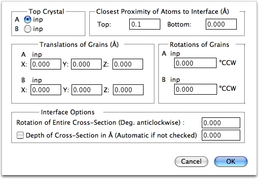 ※ 注意:晶帯軸方向の繰り返し距離は、Crystals A および B と同じではない場合があります。繰り返し距離の最大値は C 軸方向となり、他の結晶の繰り返し距離のみ原子が埋められます。短い構造での原子の占有因子は、より大きな C 軸を補正をするために変更されます。もし短い方の結晶で、他方の結晶の繰り返し距離まで原子を埋めることができるようになったら、結晶は正しくない数だけの単位格子をもち、回析パターンを計算するとき間違った反射が表れてしまうでしょう。C 軸は、Interface Options… メニューの Depth of Cross-Section の値を使って任意の値に固定することができます。