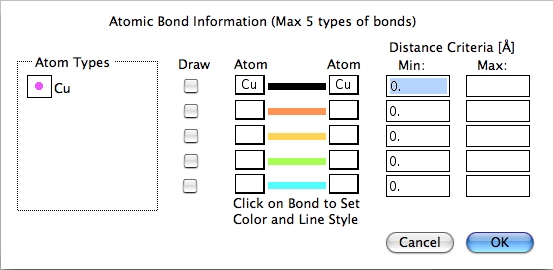 結合を描く 2つの原子を選択し、最小と最大間隔を設定します。 結合のラインをクリックすると、その色、スタイル、幅が設定できます。