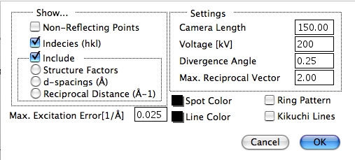 最大逆格子ベクトルは、Recip. Lattice Options… 設定ダイアログで設定できます。設定オプションには 1) パターンの指数 (hkl)、2) 構造因子、3) d-間隔、4) 逆格子ベクトルの長さがあります。Non-Reflecting Points オプションが ON になっていると、逆格子の中の無反射の位置を表示します。