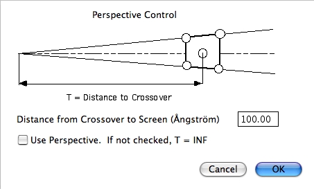 クリックすると Perspective Control ダイアログが表示されます。Use Perspective オプションが ON になっていると、スクリーンから焦点までの距離をユーザー指定の値に設定することができます。