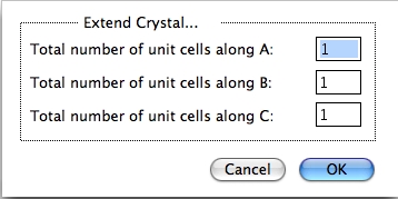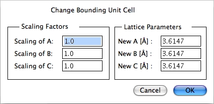 クリックすると Change Bounding Unit Cell ダイアログが表示されます。New A、B、C に数値を入力することで、単位格子のサイズを変更することができます。