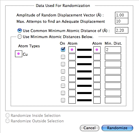 上記のダイアログを使って、各方向の原子をランダムに変更してアモルファス構造を作成するのは、あまりよい方法ではありません。デフォルト設定では、方向毎にランダムな値で原子が配置され、配置できる原子の最大数で決まる原子間距離よりも小さな値をとることはありません。もし原子間距離が原子の最大数と合わないときは、自動的に前回の値を使用し、該当する原子の数を表示してくれます。また、特定の原子間の最小距離を設定することもできます。