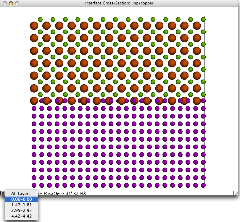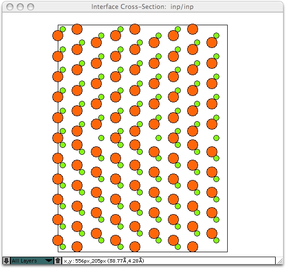 これらの原子を削除するために、Options|Interface Options…のClosest Proximity of Atoms to Interface の Top を 0.1 に設定します。ウィンドウが書き替えられ、1セットの原子が界面上に表示されます。