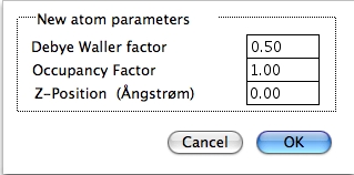 さらに、Debye-Waller 因子、占有因子、原子の z 方向 (視野の垂直方向) 高さを設定するダイアログが表示されます。