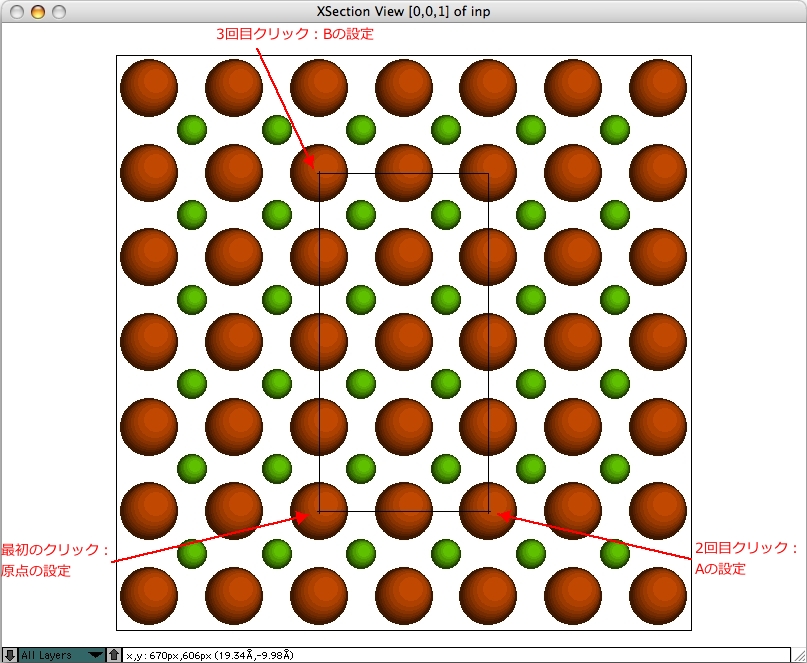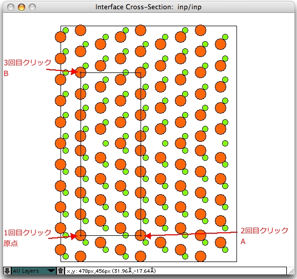 どちらかの結晶あるいは界面の断面図が作成されると、構造ファイルに書き出すための単位格子を設定することができます。まず原点を指定し、次に単位格子のベクトル (A)、つぎにベクトル (B) を指定します。Write U.Cell To File コマンドを使って、この単位格子を構造ファイルとして書き出しできます。単位格子を連続して設定した場合は、後の格子データで前の格子データが置換えられます。構造の変更、たとえば原子を移動したり削除した場合は、ファイルにもその変更が反映されます。断面を描き変えた場合は、格子データは失われます。通常、カーソルは原子の上でしか使用できませんが、Option キーを押しながらクリックすると、原子以外でのサイトでも利用できます。