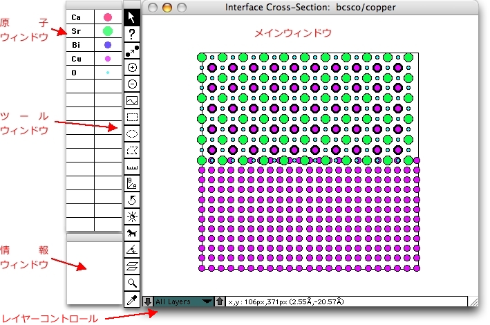 単位格子などを表示するためのウィンドウです。結晶断面は、ウィンドウ下部にあるレイヤーコントロール (上下の矢印に挟まれています) によって、特定のレイヤーを選択することができます。