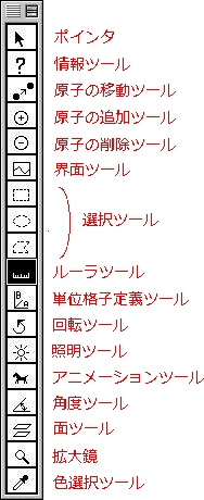 CrystalKitX で利用できるツールは以下の通りです。該当する個所をクリックすると使用できるようになります。他のツールを選択するまで使用でき、カーソルの種類で区別することができます。