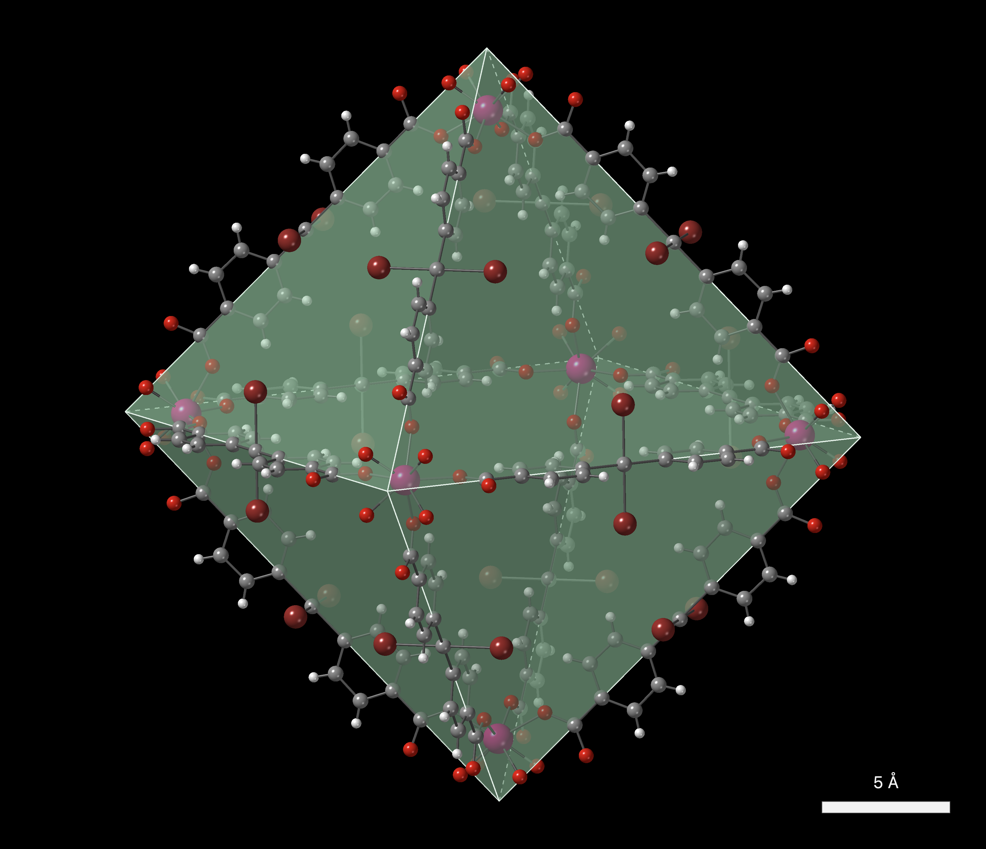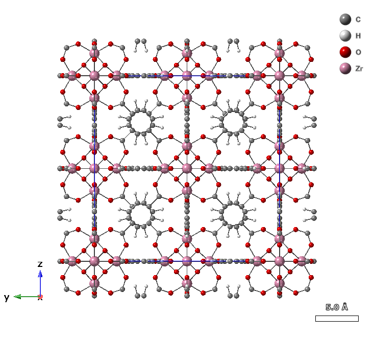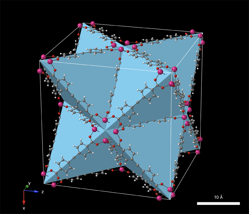 例としては、ZIF(ZIF-1、2、3、3、6など)、UIO-66、HKUST-1(Cu)、MIL-53 などがあります。 以下の図は金属有機構造体 (MOF) の UIO-66(Zn) 構造を CrystalMaker で最適化したものです。