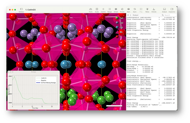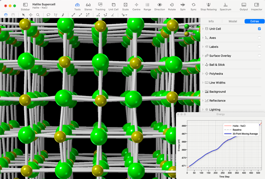 CrystalMaker 11.6 では特に金属有機構造体 MOF (Metal Organic Framework) のエネルギーモデリングが大幅に改善されています。スーパーコンピュータが必要なエネルギーモデリング計算も、デスクトップ上で実行できます。MOFのシミュレーションは簡単です。Relax ボタンをクリックするだけで、緩和構造に基づいて特性と振動を計算できます。