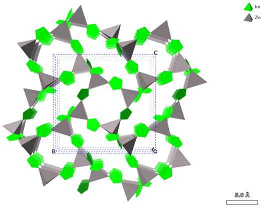 CrystalMaker 11 の最新のモデリングでは、ZIF (ゼオライト・イミダロゼート・フレームワーク) などの複雑な無機構造をモデル化できます。 「DFT」プログラムでは計算が困難なとても複雑な構造です! この多面体ビューでは、緑の五角形がイミダゾレート グループ (C3N2H3)、灰色の四面体が ZnN4 グループです。