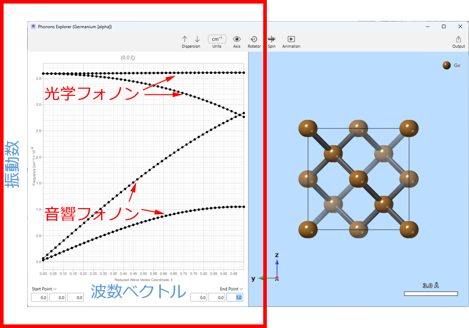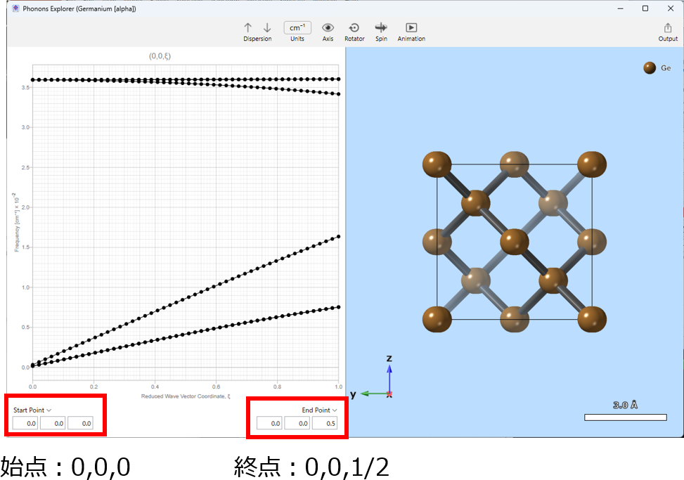 Ge の場合、(0,0,1) がブリルアンゾーンの z 方向の面の中心座標になりますので、(0,0,1) を終点に指定します。 始点と終点を選ぶと、分散曲線が作成されます:波数ベクトルに対する振動数 (frequency) のプロット(モード)です。光学フォノンと音響フォノンがこのようにあらわされます(ブランチ分枝という)。
