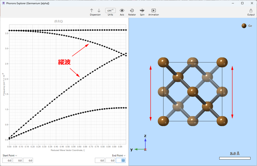 マウスで縦波を選択すると、波数ベクトル(伝播方向=z)と同じ方向に格子が振動します。 この場合、画面上側がフォノンが伝播する方向の z 方向になります。