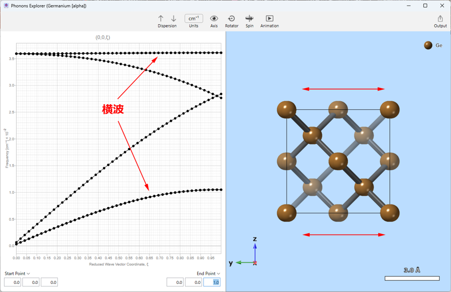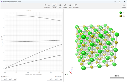 ▶CrystalMaker 11 では、結晶の振動モードを計算し、分散曲線と構造アニメーションを描画できます。これにより、逆格子空間の任意の点の格子波、すなわち「フォノン」を可視化できます。