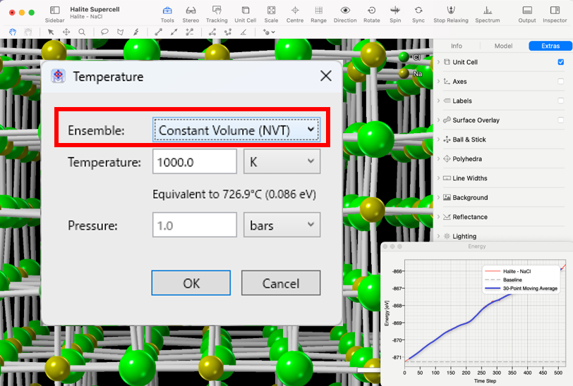 ここで、N は原子数(粒子数)、 V は体積、 T は温度、P は圧力です。NVT を選択すると、格子パラメータは固定されます。NPT を選択すると、格子パラメータが変更されます。