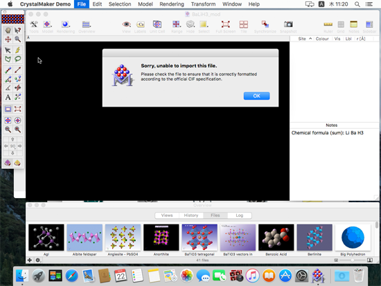 CrystalMaker 8.x Mac は、CIF 形式の結晶構造データの読み込みに対応しておりますが、OS X 10.11 El Capitan 環境では、仕様に合致しない一部の CIF ファイルの読み込みに失敗する場合があります。このような場合、CIF ファイルをテキストエディタで開き、仕様に合致しない行を修正・削除することで、読み込むことができるようになります。