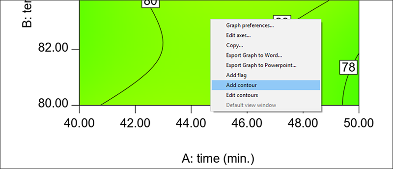 AB 等高線プロットの空き領域で右クリックし、“Add contour” を選択します。それから、等高線の周囲をドラッグします(ハイライト表示されます)。以下に示した応答値と同じように、1クリックで2つの等高線が得られる場合があります(このパターンは浅い谷間を示しています。これは後ほど3D表示について説明する際に明確になります)。