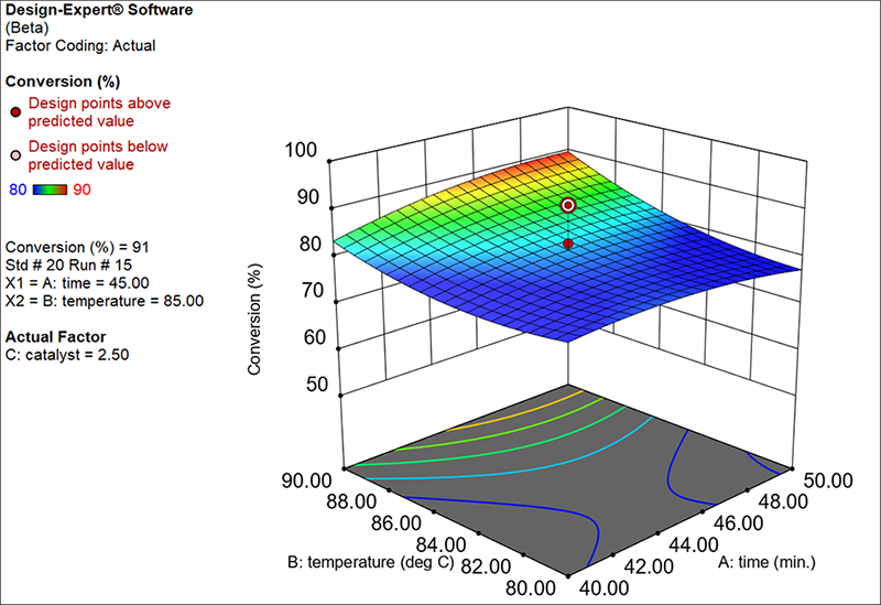 Help -> Tutorial Data に移動し、“Chemical Conversion(Analyzed)” を選択して、前の手順のデータファイルを再度開きます。次に、Analysis ブランチで “R1:Conversion” ノードをクリックし、“Model Graphs” を指定して等高線プロットを表示します。ここで、プレゼンテーションを行うときに役に立ついくつかの機能を簡単に試してみましょう。