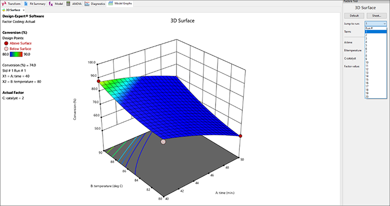 ここで、任意の試行に右のプロットを引き寄せるための、便利な機能を試してみてください。Factors Tool ツールの Run # ドロップダウンリストで “1” を選択します。3D 表示が因子 C(触媒)上の正しいスライスに移動します。しかし、現在の色は理想とする状態ではありません。そのため、グラデーション上で右クリックし Edit Legend ダイアログボックスで “Defaults” ボタンをクリックします。以下のグラフと同じようになるはずです。