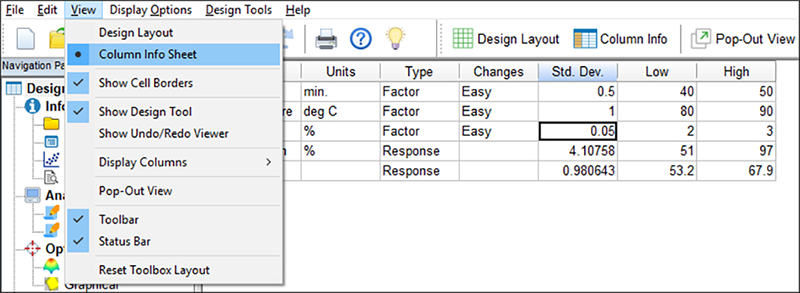 同じ段階から分析を開始するために、 Chemical Conversion(analyzed) という名称のファイルをもう一度開きます。次に、画面左側にある “Design” ノードをクリックして計画割付表の画面を再開します。画面が表示されたら、“View” メニューの “Column Info Sheet” を選択してください。Std. Dev. 列に各因子の標準偏差を、次のように入力します。time:「0.5」、 temperature:「1.0」、 catalyst:「0.05」。入力後の画面は以下のようになっているはずです。