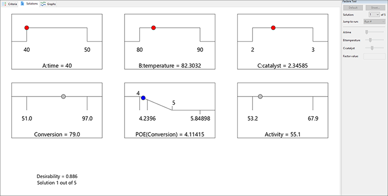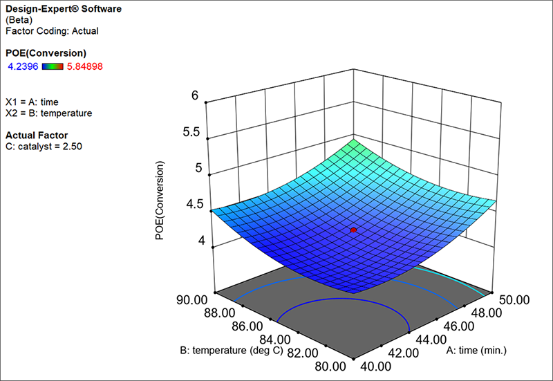 上記の最適解は、反応率を最大化し、活性の目標値 63 を達成すると同時に、応答に伝播する誤差が最小になる点を見いだしています。従って、これは因子設定のわずかなばらつきに対して、堅牢なプロセス条件を表すことになります。このケースの場合は、POE を考慮するか否かで大きな違いはありません(このことは前に戻って自分で確かめてください)。しかし、これが問題になってくる場合もありますので、POE の視点も見落とさないようにしてください。