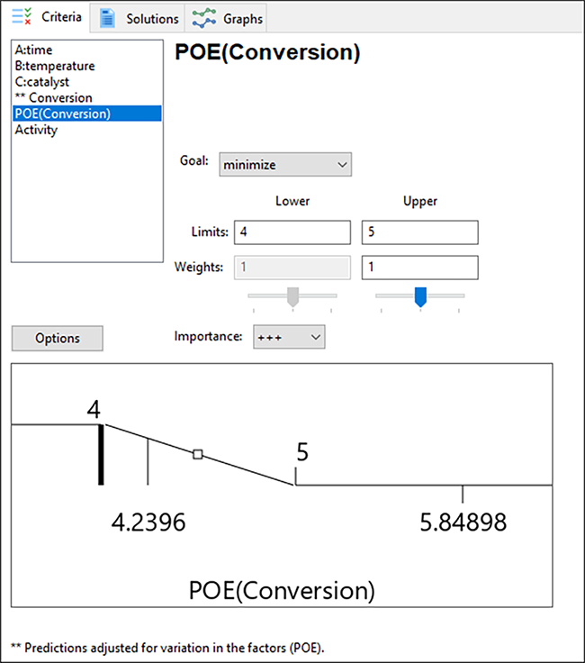 以上で、Conversion に関する POE が求められましたので、前に戻り、それを最適化の基準に加えていきましょう。Optimization ブランチの “Numerical” ノードをクリックしてください。リストから “POE(Conversion)” を選び、その Goal に “minimize” を選択したら、Lower Limit に「4」を、Upper Limit に「5」を以下のように設定してください。