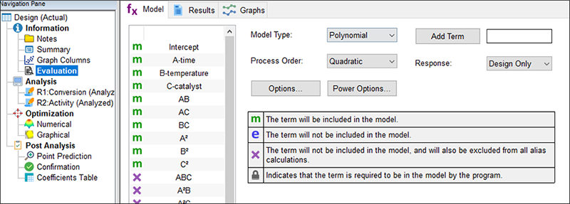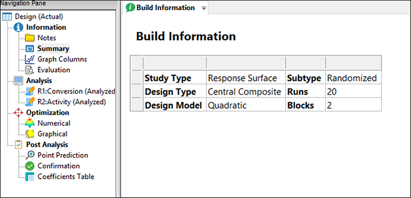 この計画のサマリーには、計画タイプとして中心複合計画(CCD: central composite design)がブロック数2で選択され、モデルとして2次の当てはめが適用されていることがレポートされています。“Evaluation” ノードをクリックしましょう。Design-Expert では、この計画で使用するモデルの次数が既に仮定されていることをご確認ください。