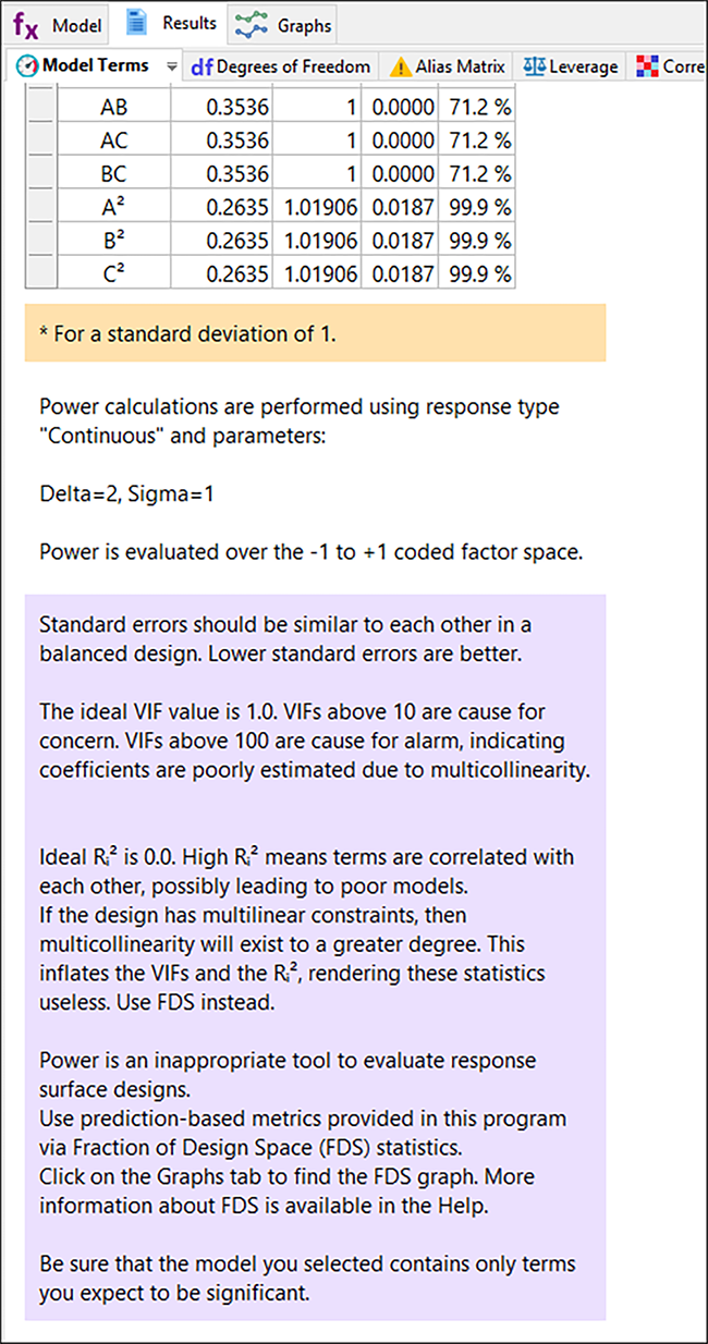 Design-Expert には、RSM 計画を評価する強力なツールが用意されています。計画の評価は、応答データを収集する前段階でなされるべきことですが、事後的に行うことも可能です。例えば、計画した設定点に明らかな偏差があり、それを反映させるために因子水準に変更を加える必要があることに気がつくかもしれません。あるいは、試行数が全く足りないかもしれません(少なくとも応答の一部について)。そのような場合は、計画を再評価してその損害を調べる価値があるでしょう。