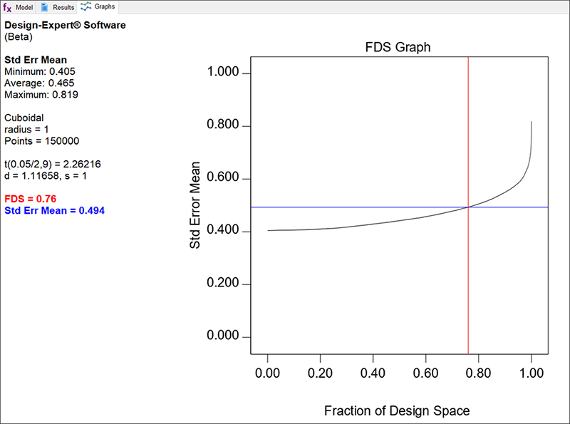 FDS グラフの “y” 軸は、実験領域の大量のサンプリングに基づいて(凡例に表示されているようにデフォルトで設定されるのは 150,000 ポイント)、全空間内の任意の構成比において予測される最大の変動幅を数値で表します。例えば、画面左側の凡例に記載されているように、この応答曲面法(RSM)計画の割合が 80% のところでは、標準誤差(SE)の値がおよそ 0.5 以下となっています。なお、無作為サンプリングアルゴリズムにより実際の FDS は若干異なる場合がありますのであらかじめご了承ください。別の計画と評価を比べる場合は、FDS 曲線が低くて平らな方を優先してください。