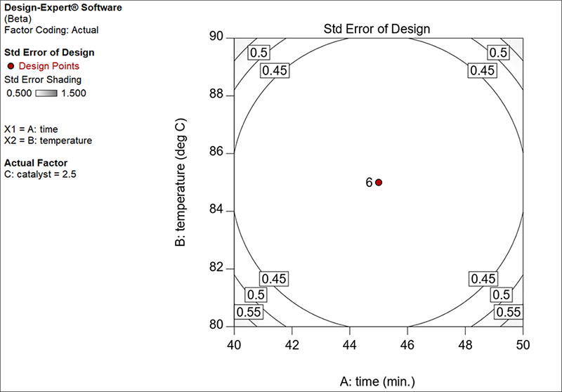 FDS では、予測能力に関する情報が提供されます。計画の “rotatability”(回転可能性)基準を見てみましょう。“View” -> “contour” を選択してください。Design-Expert には、標準誤差プロットが表示されます。これは、予測に関する分散が設計空間全体にどう影響するかを表すものです。