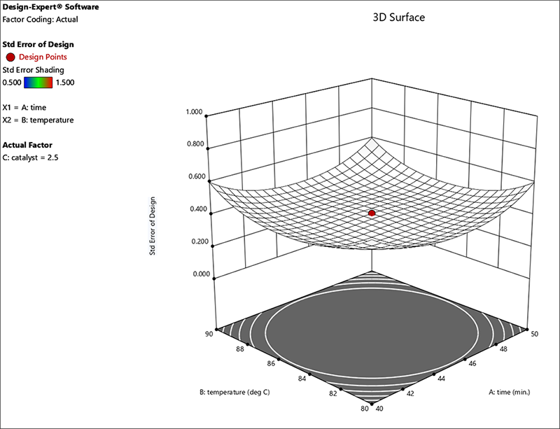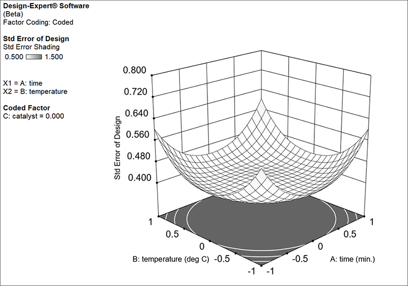 標準誤差を表すこのボウル状の曲面の底が、平坦になっている点に注目してください(このプロットの底は Y 軸の low を 0.4 にし、high を 0.8 に変更することで作成されました)。この形状は、RSM 計画にとって非常に望ましいものです。まさに理想的な出来栄えです。