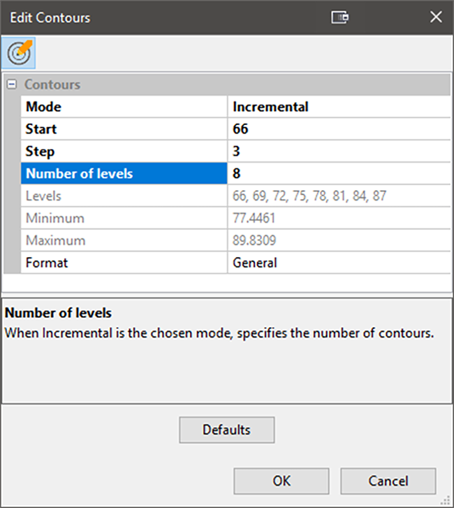| ※ 別の方法で等高線の値を設定する プロット上で右クリックして “Edit contours” を選択します。ここで Mode は “Incremental” オプションを選択し、Start に「66」、Step に「3」、Levels には「8」と入力します。 ![]() Edit contoursウィンドウで等高線の増分値を設定する この手法を用いる場合は、最初に必ず Min と Max 値を確認してください。そうすることで等高線が始まる場所と、その幅の大きさの手掛かりを得ることができます。 |