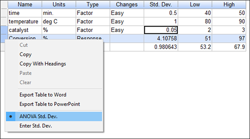 同じ段階から分析を開始するために、 Chemical Conversion(analyzed) という名称のファイルをもう一度開きます。次に、画面左側にある “Design” ノードをクリックして計画割付表の画面を再開します。画面が表示されたら、“View” メニューの “Column Info Sheet” を選択してください。Std. Dev. 列に各因子の標準偏差を、次のように入力します。time:「0.5」、 temperature:「1.0」、 catalyst:「0.05」。入力後の画面は以下のようになっているはずです。