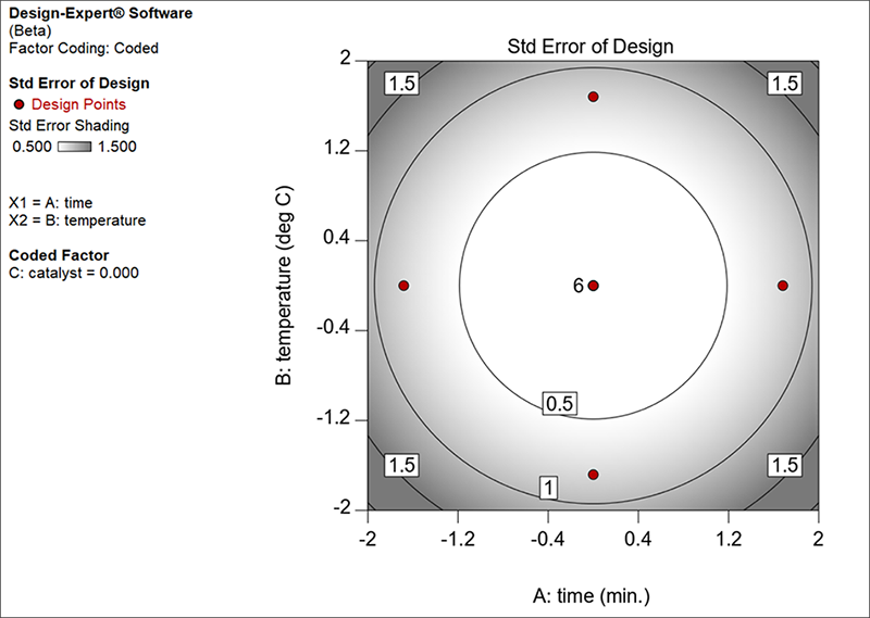 FDS では、予測能力に関する情報が提供されます。計画の “rotatability”(回転可能性)基準を見てみましょう。“View” -> “contour” を選択してください。Design-Expert には、標準誤差プロットが表示されます。これは、予測に関する分散が設計空間全体にどう影響するかを表すものです。