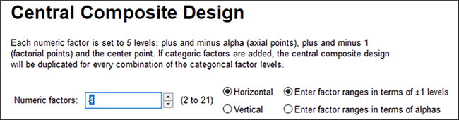 をクリックするか、“New Design” をクリックします。画面左のStandard Designs の下の、“Response Surface”をクリックしてツリーを展開し、Split-Plot セクションから “Central Composite”(CCD)を選択します。因子の数として “4” をドロップダウンリストから選択します。
