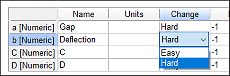 因子 a の名称に「Gap」と入力します。なお、この因子は既に変更困難な因子にラベル付けされていますが、これは分割法を選択したからです。因子 b をクリックして2番目の因子名として「Deflection」と入力します。Tab キーで Change 列に移動したら、「h」と入力し、これを Hard に変更します。ドロップダウンリストをクリックして変更することもできますが、直接入力するほうが簡単です。