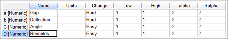 Low と High の水準の因子は入力する必要はありません。この例の著者からは、コード化された(-1 から +1)の水準しか提供されていないからです(実測値はありません)。恐らく情報を保護する必要があったのでしょう。次に、因子 C をクリックして、因子名は「Angle」と入力します。さらに、因子 D の名前として「Reynolds」と入力します。これらは ETC 因子のため、Change 列はデフォルトの Easy のままにします。