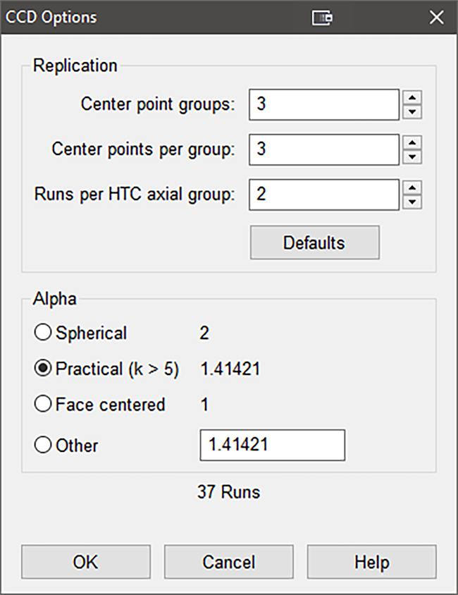 | ※ 分割法 CCD の構成について この CCD の 3因子の配置を図で示すと以下のようになります。核となる要因が立方体の頂点として構成されており、コード化された2つの構成単位(上記に記載した -1 から 1)が向かい合う面の距離となります。星印は軸点(axial point)を表します。中心からこの軸点をどれだけ遠ざけるべきかについては、統計学者間で大いに議論される問題です。この距離は、コード化された因子の水準を尺度とする “Alpha” で指定します。これから順次見て行きますが、Design-Expert にはアルファに関する様々なオプションが用意されています。アルファのデフォルト “Rotatable” は、予測内における標準誤差の分布(不確実性)を示すのに最も優れています。そのため、設定はデフォルトのままが好ましいですが、変更していけないわけではありません。回転可能なアルファには、中心からさらに遠くなるような星印のポイントが必要です(この場合は、コード化された単位で 2.0)。そのため、いつでも実行可能なわけではありません。星印のポイントの水準が中心から離れすぎていると、測定可能な結果が得られない場合があります。この理由から、アルファに Practical を使用することで星印を少し引き寄せて、実験を確実に試行することで有益な結果を得ることができます。Rotatable を指定すると因子が多くなったときに扱いにくくなるため、5 因子(k > 5)より多い場合は Alpha を Practical にすることをお勧めします。 ![]() 3因子の中心複合計画 分割法を用いた中心複合計画においては、アルファ水準に加えてグループの複雑な関係が存在しています。ページの下部、Options ボタンのそばを見ると、この計画がどのようにグループ分けされたのか分かります。 ![]() グループに分解した分割法を用いたCCD計画 それぞれの種類のポイントで、グループの番号と各グループの試行番号が表示されます。これらは Options ダイアログボックスで変更することもできますが、この例ではデフォルトのままにしておきます。 |