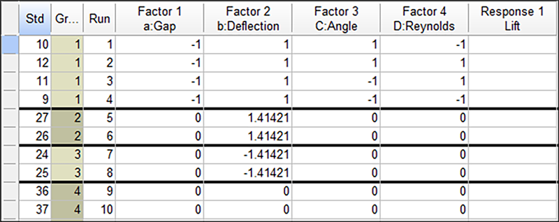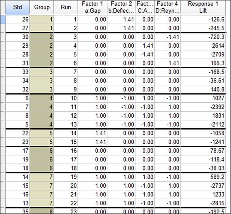 “whole-plot” を構成する HTC 因子の組み合わせを把握するために、Group 列が追加されています。グループは黒い横線で区切られている点に注目してください。どのグループの試行も HTC 因子の水準は一定に保たれています。例えば、Group 1 では、どの試行も Gap が 0 に設定され、Deflection が 1.41421 に設定されています。Group 2 の4つの試行については、すべて gap が mid-level(0)に設定され、因子 B も mid-level(0)に設定されています。