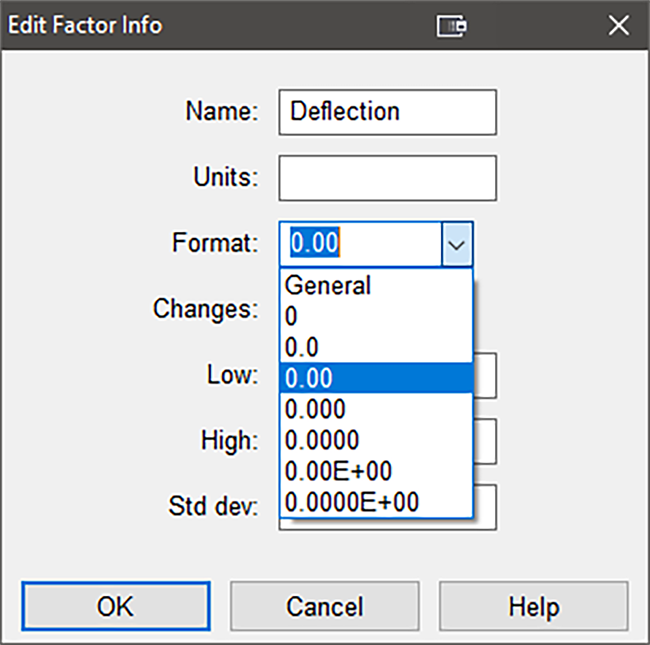 有効桁数を減らすには Deflection の列の上で右クリックし、“Edit Info” を選択します。Format ドロップダウンリストから “0.00” を選択すると小数点 2 桁を残すことができます。4因子すべてに対してこの操作を行って、計画をより見やすく、実行しやすくします。