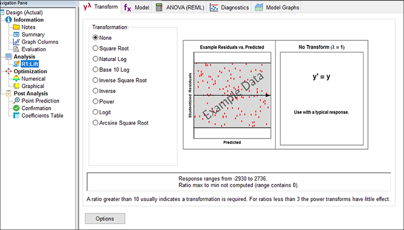 | ※ 分割法の詳細 最尤推定の目的は、データが観測される可能性を最大にするパラメータ値を見つけ出すことです。制限付き最尤法は、Model 画面の Analysis メニューをクリックして変更しない限り、標準で使用される分散予測の手法の一つです。分割法における REMLでは、whole-plotにおける因子のグループの分散と、subplotにおける因子の残差の分散を予測します。分散が予測されると一般最小二乗法(GLS)を使用して因子効果が予測されます。それから、Kenward-Roger 法を使用して F 検定と対応する p 値が示されます。詳細については電球アイコンをクリックし、スクリーンチップスのリンクを参照してください。 |
