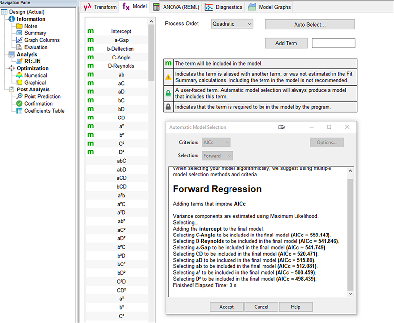 DX には、モデル選択で追加される項が表示され、各段階の AICc 基準が表示されます。アルゴリズムモデルの選択と使用した基準の詳細については Help ボタンをクリックしてください。そうでない場合は、“Accept” をクリックして次に進んで結果のモデルを評価してください。