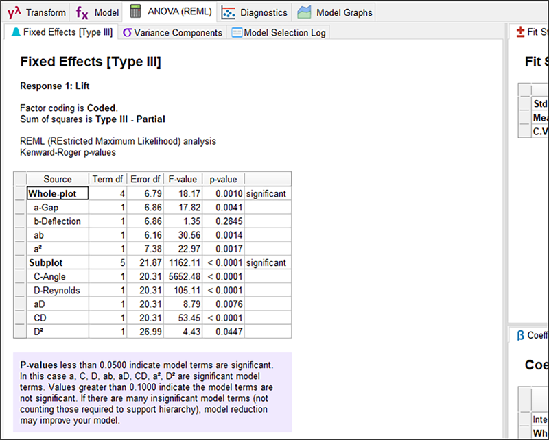 この表における統計と通常の ANOVA の大きな違いは、HTC 因子は Whole-plot で、ETC 因子は Subplot で分散項がグループ化されることです。Whole-plot の p 値(Prob>F)をみてください。一般的に許容されているアルファ水準 0.05 よりはるかに低い p 値となっており、高い有意性を示しています。つまり、すべての項はモデルの Whole-plot(HTC)の一部を構成しています。個々のwhole-plotの項の p 値も確認することができます。p 値が 0.28 の b-Deflection 因子以外は申し分ありません。しかしこの項は、有意な ab 交互作用をサポートする階層に含まれていることを忘れないでください。