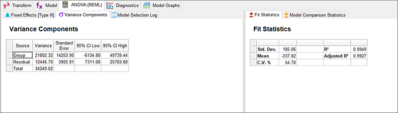 全体の subplot の項は、個々すべての subplot 項と同様に有意です。次に、“Variance Components” タブ(ペインのレイアウトによって場所は異なります)をクリックして、さまざまな統計が REML 解析の引数に表示されるのを確認してください。