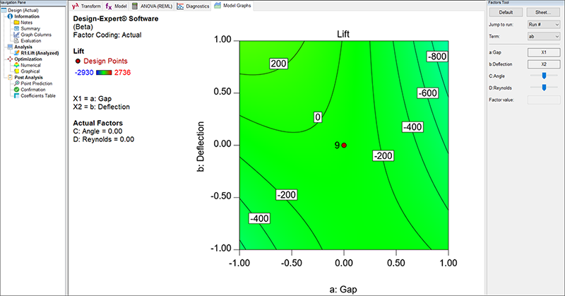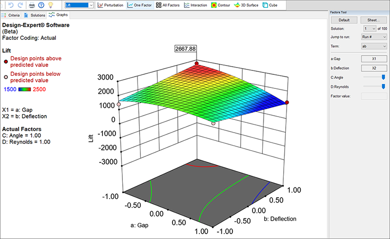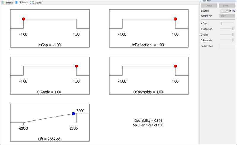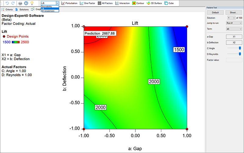 最良の結果は、Gap(a)が低い水準、Deflection(b)が高い水準、Angle(C)が高い水準、そして、Reynolds(D)が高い水準のときになります。これは Gap(a)と Deflection(b)の間の等高線プロットで確認した内容と一致します。これらの設定により揚力は 2667.9 を達成します。これ以外のすべての解は、上に示された番号をクリックして確認することができますが、いずれも、揚力はこれよりも低い値になります。