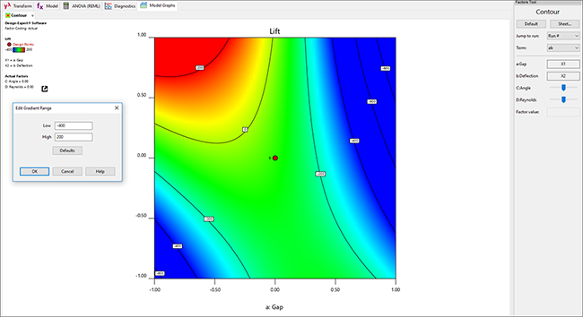 最初に表示される等高線プロットには、手を加えたい点が多くあります。使用しているカラースケールではどこも強調しておらず、このプロット全体が緑色となっています。通常は、“緑” のままでも良いですが、少し色の変化があるとさらに使いやすくなるでしょう。これを行うには、凡例のカラースケール上で右クリックし “Edit Gradient Range” ダイアログボックスを表示します。Low の値を、グラフ上で最も低い等高線の値の1つである「-400」にして、High の値を最高の値である「200」に変更してください。