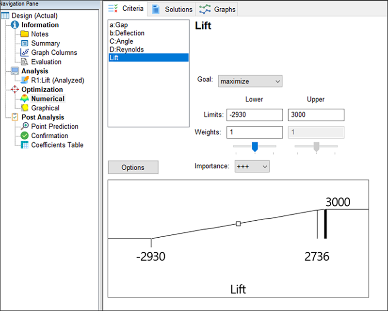 こうした傾向が他の場所でも同じかどうか、また、因子 C(迎え角)と 因子 D(レイノルズ数)が、結果にどのような影響を与えているかを調べるには数値の最適化を使用します。DXの “Optimization” ブランチ下の “Numerical” ノードをクリックしてください。“Lift” をクリックしたら、Goal を “Maximize” に、Upper limit を「3000」に設定します。