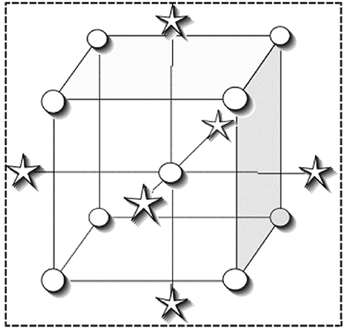 | ※ 分割法 CCD の構成について この CCD の 3因子の配置を図で示すと以下のようになります。核となる要因が立方体の頂点として構成されており、コード化された2つの構成単位(上記に記載した -1 から 1)が向かい合う面の距離となります。星印は軸点(axial point)を表します。中心からこの軸点をどれだけ遠ざけるべきかについては、統計学者間で大いに議論される問題です。この距離は、コード化された因子の水準を尺度とする “Alpha” で指定します。これから順次見て行きますが、Design-Expert にはアルファに関する様々なオプションが用意されています。アルファのデフォルト “Rotatable” は、予測内における標準誤差の分布(不確実性)を示すのに最も優れています。そのため、設定はデフォルトのままが好ましいですが、変更していけないわけではありません。回転可能なアルファには、中心からさらに遠くなるような星印のポイントが必要です(この場合は、コード化された単位で 2.0)。そのため、いつでも実行可能なわけではありません。星印のポイントの水準が中心から離れすぎていると、測定可能な結果が得られない場合があります。この理由から、アルファに Practical を使用することで星印を少し引き寄せて、実験を確実に試行することで有益な結果を得ることができます。Rotatable を指定すると因子が多くなったときに扱いにくくなるため、5 因子(k > 5)より多い場合は Alpha を Practical にすることをお勧めします。 ![]() 3因子の中心複合計画 分割法を用いた中心複合計画においては、アルファ水準に加えてグループの複雑な関係が存在しています。ページの下部、Options ボタンのそばを見ると、この計画がどのようにグループ分けされたのか分かります。 ![]() グループに分解した分割法を用いたCCD計画 それぞれの種類のポイントで、グループの番号と各グループの試行番号が表示されます。これらは Options ダイアログボックスで変更することもできますが、この例ではデフォルトのままにしておきます。 |